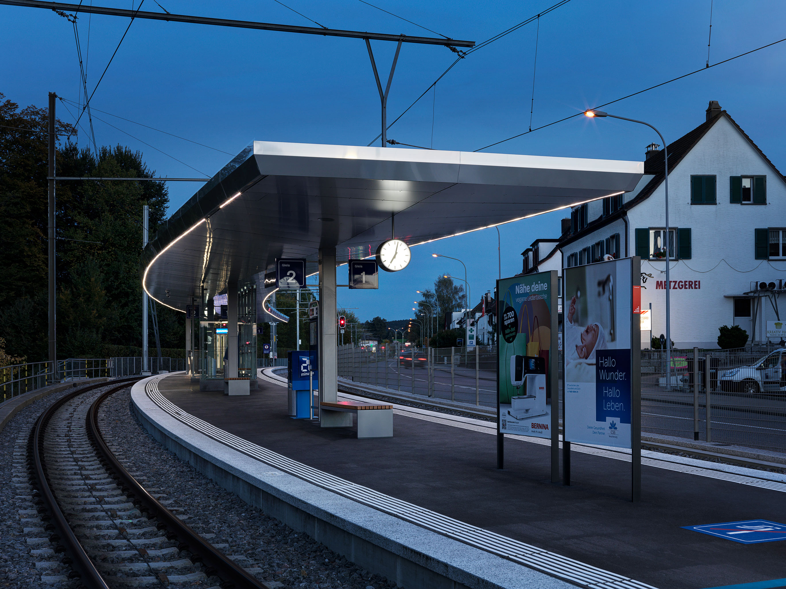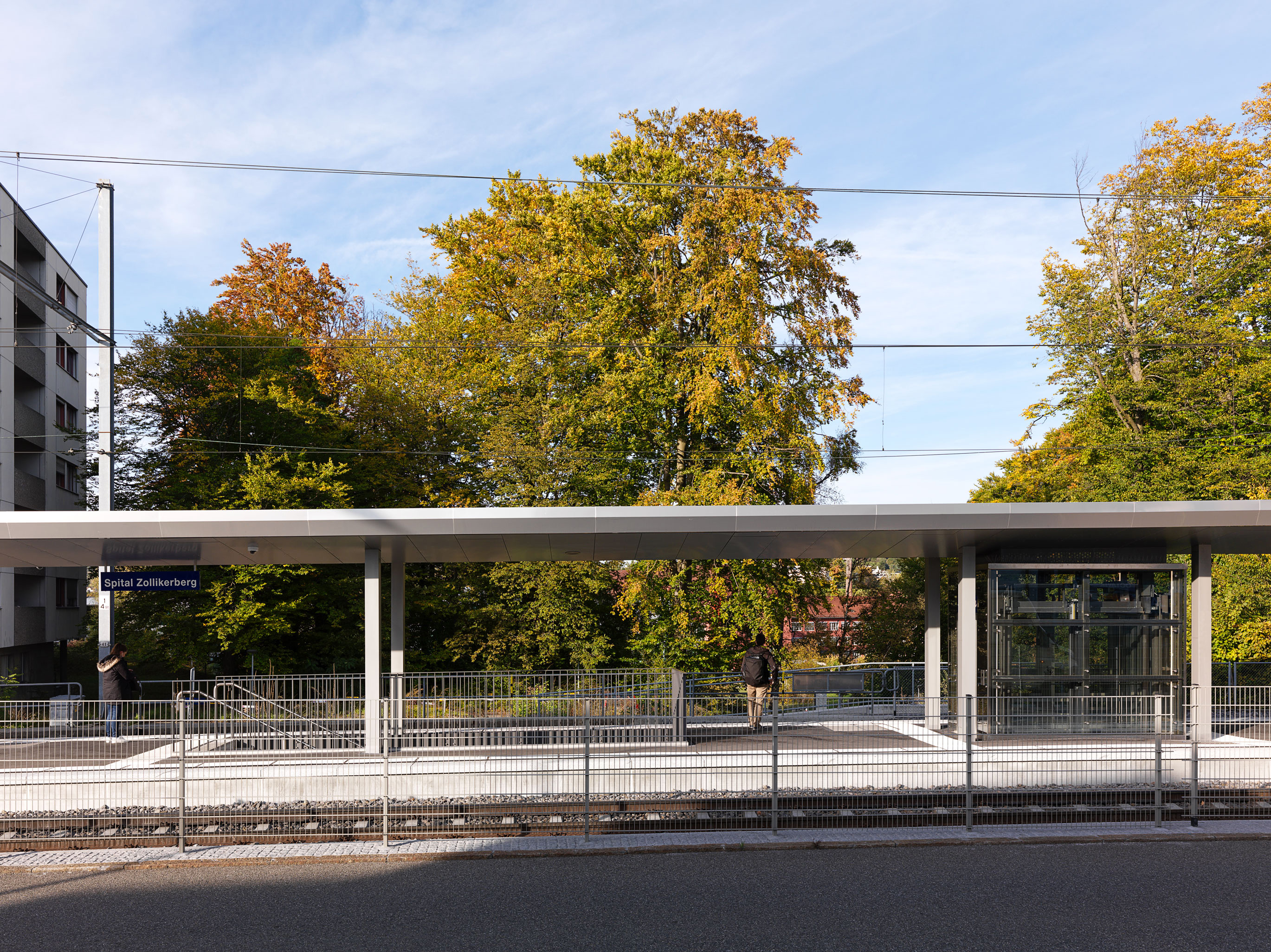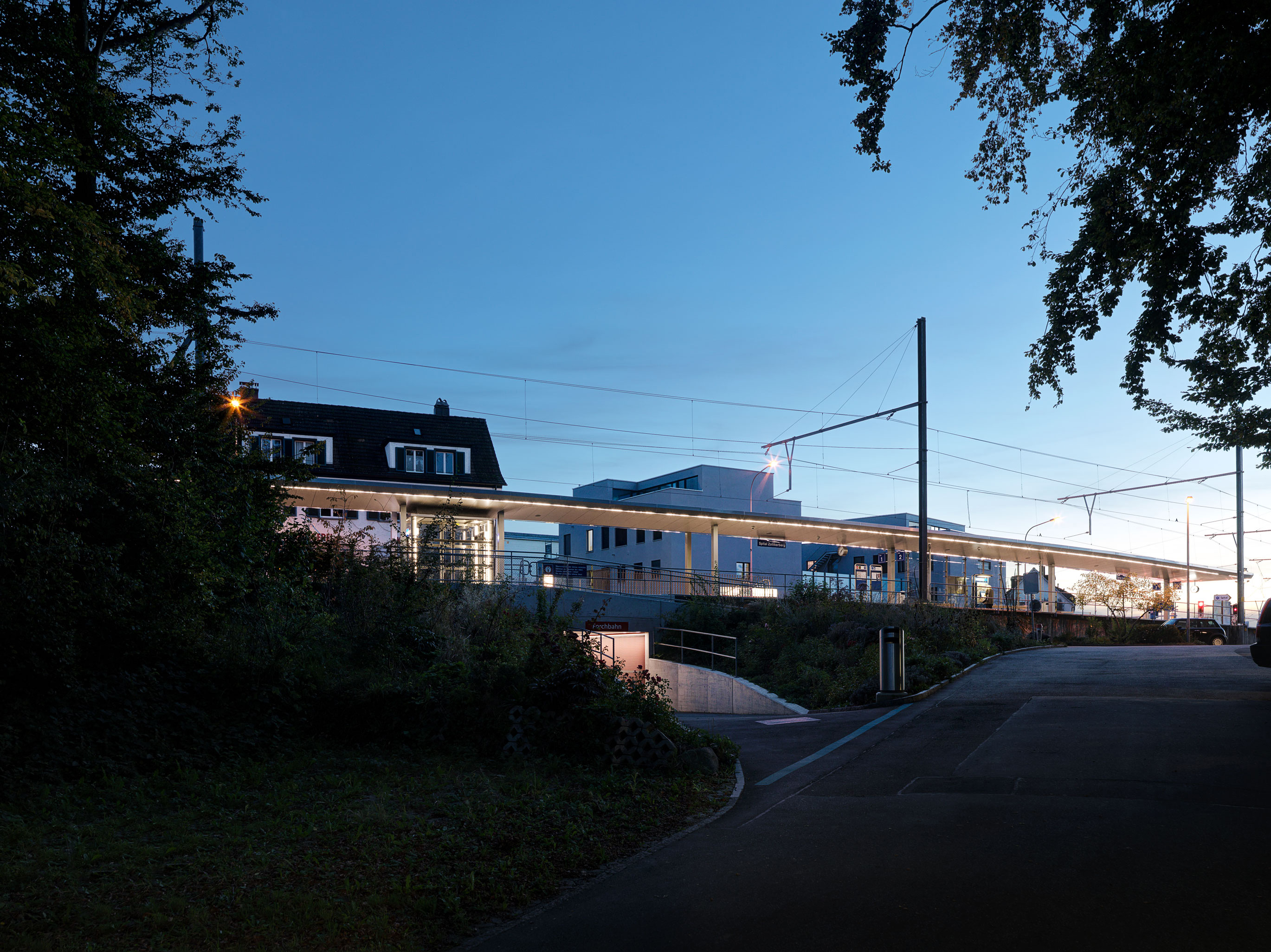 Forchbahn, Haltestelle Spital Zollikerberg Projekt eines 70 m langen geschwungenen Perrondachs Auftragsart: öffentliche Ausschreibung Projekt/Ausführung: 2017 - 2018 Bilder: Pierre Kellenberger